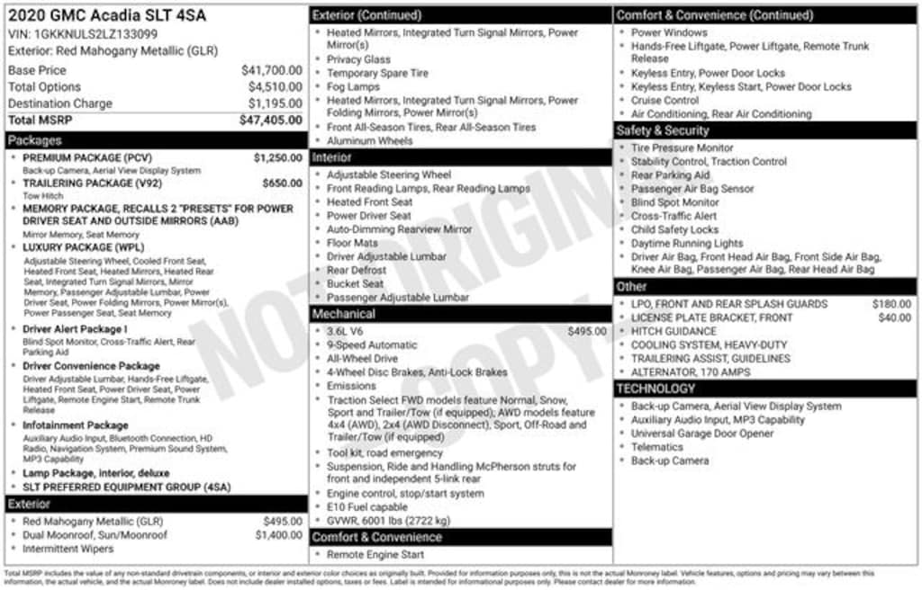Key Chrysler Dodge Jeep Ram of Rochester is proud to present you with another True Market Priced Pre-Owned Vehicle. Transparent Pricing Of $ !! This 2020 GMC Acadia SLT is loaded with the following Factory Options: AWD and Jet Black Leather Luxury Package (8-Way Power Passenger Seat Adjuster, Heated & Ventilated Driver & Front Passenger Seats, Heated Rear Outboard Seating Positions, Power Passenger Lumbar Control Seat Adjuster, Power Tilt & Telescopic Steering Column, and Power-Adjustable Body-Color Outside Heated Mirrors), Memory Package, Preferred Equipment Group 4SA, Premium Package (HD Surround Vision), Trailering Package (170 Amp Alternator, Heavy-Duty Cooling System, Hitch Guidance, and Trailering Assist Guidelines), AWD, Jet Black Leather, 18" Machined Aluminum Wheels, 3rd row seats: split-bench, 4-Way Manual Passenger Seat Adjuster, 4-Wheel Disc Brakes, 6 Speakers, 6-Passenger (2-2-2 Seating Configuration), 6-Speaker Audio System Feature, 8-Way Power Driver Seat Adjuster, ABS brakes, Air Conditioning, Alloy wheels, AM/FM radio: SiriusXM, Apple CarPlay/Android Auto, Auto High-beam Headlights, Auto-dimming door mirrors, Auto-dimming Rear-View mirror, Automatic temperature control, Brake assist, Bumpers: body-color, Compass, Delay-off headlights, Driver door bin, Driver vanity mirror, Dual front impact airbags, Dual front side impact airbags, Dual SkyScape 2-Panel Power Sunroof, Electronic Stability Control, Emergency communication system: OnStar and GMC connected services capable, Four wheel independent suspension, Front & Rear Splash Guards, Front anti-roll bar, Front Bucket Seats, Front Center Armrest, Front dual zone A/C, Front fog lights, Front License Plate Bracket, Front reading lights, Fully automatic headlights, Garage door transmitter, Heated door mirrors, Heated Driver & Front Passenger Seats, Heated front seats, Illuminated entry, Knee airbag, Low tire pressure warning, Occupant sensing airbag, Outside temperature display, Overhead airbag, Overhead console, Panic alarm, Passenger door bin, Passenger vanity mirror, Perforated Leather-Appointed Seat Trim, Power door mirrors, Power Driver Lumbar Control Seat Adjuster, Power driver seat, Power Liftgate, Power steering, Power windows, Premium audio system: GMC Infotainment System, Radio data system, Radio: AM/FM 8" Diagonal Multi-Touch Nav (DISC), Radio: AM/FM 8" Diagonal Multi-Touch Navigation, Rear air conditioning, Rear anti-roll bar, Rear reading lights, Rear window defroster, Rear window wiper, Remote keyless entry, Roof rack: rails only, Security system, SiriusXM Radio, SiriusXM w/360L, Speed control, Speed-sensing steering, Spoiler, Steering wheel mounted audio controls, Tachometer, Telescoping steering wheel, Tilt steering wheel, Traction control, Trip computer, Turn signal indicator mirrors, Variably intermittent wipers, and Voltmeter!!