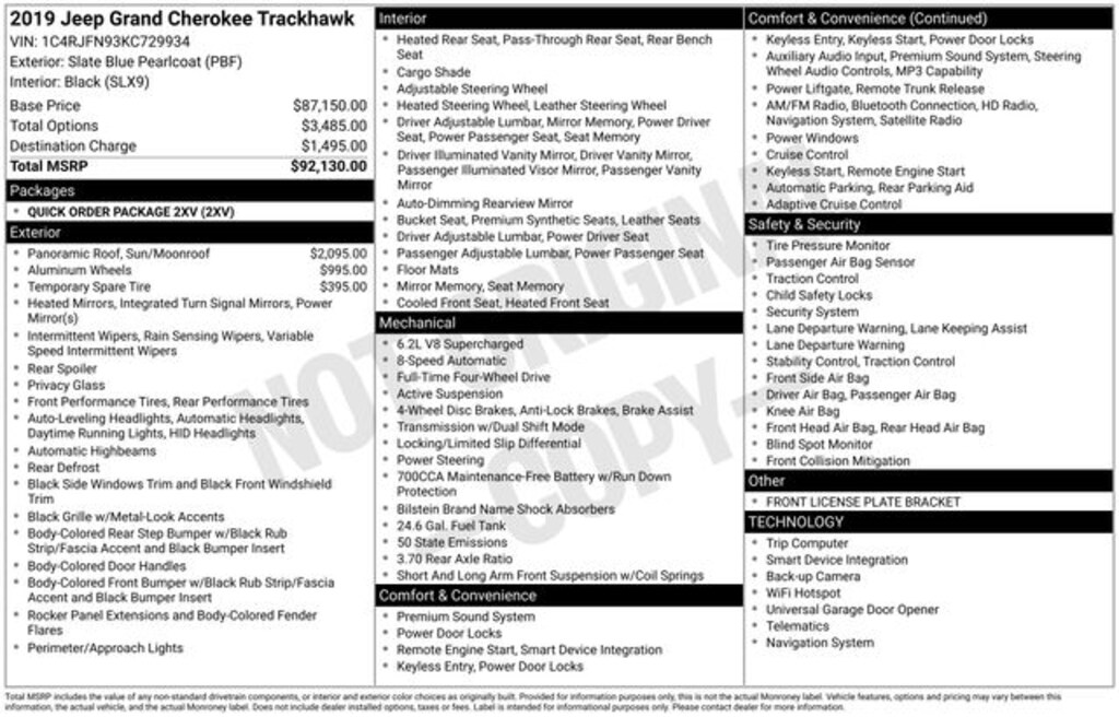 Key Chrysler Dodge Jeep Ram of Rochester is proud to present you with another True Market Priced Pre-Owned Vehicle. Transparent Pricing Of $ !! This 2019 Jeep Grand Cherokee Trackhawk is loaded with the following Factory Options: 4WD Quick Order Package 2XV, 4WD, 10 Speakers, 3.70 Rear Axle Ratio, 4-Wheel Disc Brakes, 8.4" Touchscreen Display, ABS brakes, Adaptive suspension, Air Conditioning, Alloy wheels, AM/FM radio: SiriusXM, Anti-whiplash front head restraints, Apple CarPlay/Android Auto, Audio memory, Auto High-beam Headlights, Auto-dimming door mirrors, Auto-dimming Rear-View mirror, Automatic temperature control, Brake assist, Bumpers: body-color, Compass, Competition Suspension, Delay-off headlights, Driver door bin, Driver vanity mirror, Dual front impact airbags, Dual front side impact airbags, Dual-Pane Panoramic Sunroof, Electronic Stability Control, Emergency communication system: SiriusXM Guardian, Four wheel independent suspension, Front anti-roll bar, Front Bucket Seats, Front Center Armrest w/Storage, Front dual zone A/C, Front License Plate Bracket, Front reading lights, Fully automatic headlights, Garage door transmitter, Headlight cleaning, Heated door mirrors, Heated front seats, Heated rear seats, Heated steering wheel, Heavy-Duty Engine Cooling, High intensity discharge headlights: Bi-Xenon, Illuminated entry, Knee airbag, Leather Shift Knob, Low tire pressure warning, Memory seat, Navigation System, Occupant sensing airbag, Outside temperature display, Overhead airbag, Overhead console, Panic alarm, ParkView Rear Back-Up Camera, Passenger door bin, Passenger vanity mirror, Power door mirrors, Power driver seat, Power Liftgate, Power passenger seat, Power steering, Power windows, Premium Headliner Module, Radio data system, Radio: Uconnect 4C Nav w/8.4" Display, Rain sensing wipers, Rear anti-roll bar, Rear reading lights, Rear seat center armrest, Rear window defroster, Rear window wiper, Remote keyless entry, Security system, Speed control, Speed-sensing steering, Speed-Sensitive Wipers, Split folding rear seat, Spoiler, Steering wheel mounted audio controls, Suede/Nappa Performance Seats, Tachometer, Telescoping steering wheel, Tilt steering wheel, Traction control, Trip computer, Turn signal indicator mirrors, Variably intermittent wipers, Ventilated front seats, Wheels: 20" x 10.0" Black Satin Aluminum, and Wheels: 20" x 10.0" Forged Polished Face!!