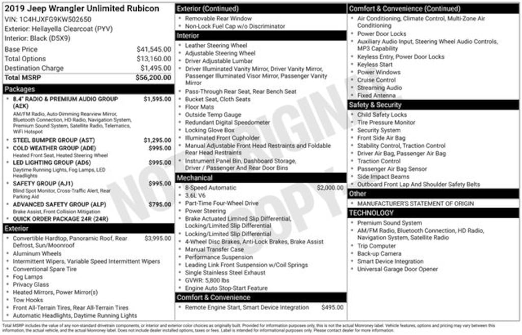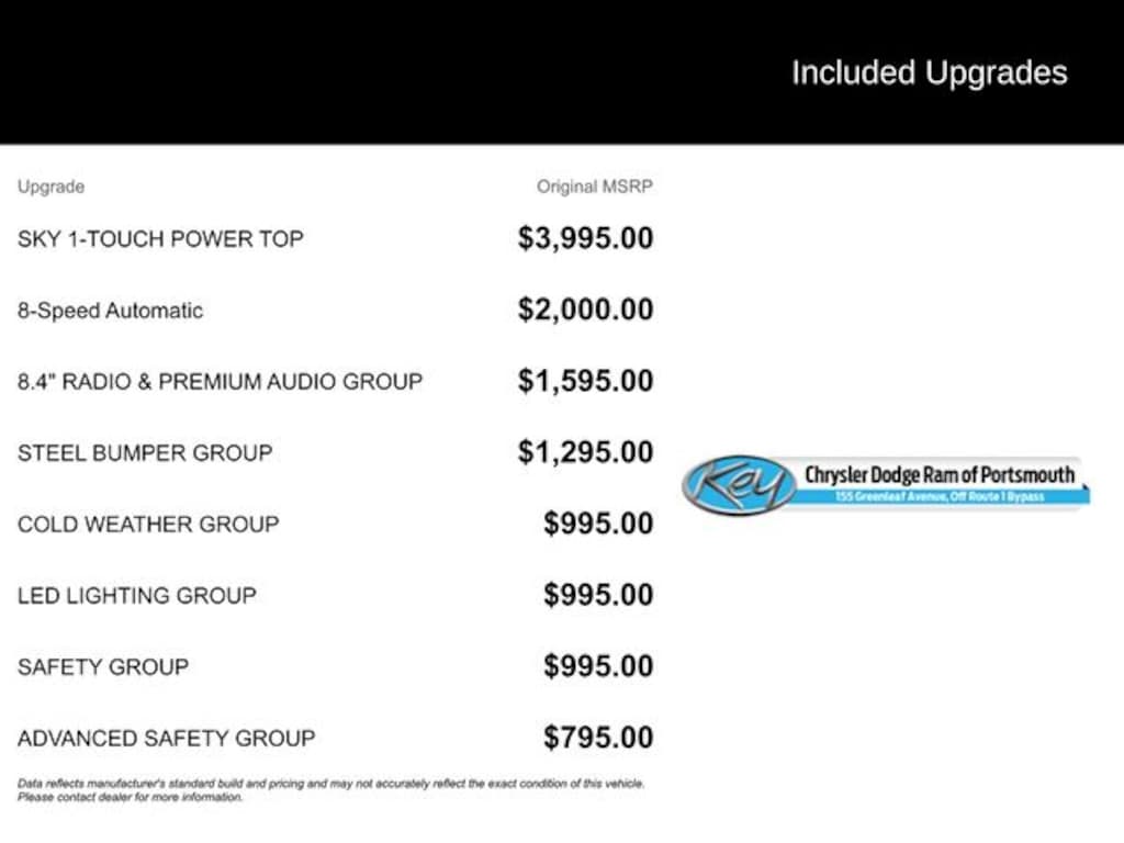 Key Chrysler Dodge Ram of Portsmouth is proud to present you with another True Market Priced Pre-Owned Vehicle. Transparent Pricing Of $ !! This 2019 Jeep Wrangler Unlimited Rubicon is loaded with the following Factory Options: 8.4" Radio & Premium Audio Group (1-Year SiriusXM Guardian Trial, 4G LTE Wi-Fi Hot Spot, 5-Year SiriusXM Traffic Service, 5-Year SiriusXM Travel Link Service, 8.4" Touchscreen Display, Auto-Dimming Rear-View Mirror, Emergency/Assistance Call, For Details, Visit DriveUconnect.ca, GPS Navigation, HD Radio, Radio: Uconnect 4C Nav w/8.4" Display, SiriusXM Traffic Plus, and SiriusXM Travel Link), Advanced Safety Group (Advanced Brake Assist and Full Speed Forward Collision Warning Plus), Cold Weather Group (Heated Front Seats and Heated Steering Wheel), LED Lighting Group (Daytime Running Lamps LED Accents, Front LED Fog Lamps, LED Reflector Headlamps, and LED Taillamps), Quick Order Package 24R, Safety Group (Blind Spot & Cross Path Detection and ParkSense Rear Park Assist System), Steel Bumper Group (Steel Front Bumper and Steel Rear Bumper), 4-Wheel Disc Brakes, 4.10 Rear Axle Ratio, 8 Speakers, ABS brakes, Air Conditioning, Alloy wheels, Alpine Premium Audio System, AM/FM radio: SiriusXM, Apple CarPlay/Android Auto, Automatic temperature control, Brake assist, Compass, Delay-off headlights, Driver door bin, Driver vanity mirror, Dual front impact airbags, Dual front side impact airbags, Electronic Stability Control, Front anti-roll bar, Front Bucket Seats, Front Center Armrest w/Storage, Front dual zone A/C, Front fog lights, Front reading lights, Fully automatic headlights, Garage door transmitter, Heated door mirrors, Illuminated entry, Integrated roll-over protection, Leather steering wheel, Low tire pressure warning, Manufacturer's Statement of Origin (DISC), Non-Lock Fuel Cap w/o Discriminator, Occupant sensing airbag, Outside temperature display, Panic alarm, ParkView Rear Back-Up Camera, Passenger door bin, Passenger vanity mirror, Performance Suspension, Power door mirrors, Power steering, Power Top Quarter Window Storage Bag, Power windows, Premium Cloth Low-Back Bucket Seats, Radio data system, Radio: Uconnect 4 w/7" Display, Rear anti-roll bar, Rear reading lights, Rear Window Defroster, Rear Window Wiper/Washer, Remote keyless entry, Remote Start System, Removable Rear Quarter Windows, Security system, Sky 1-Touch Power Top, Speed control, Split folding rear seat, Steering wheel mounted audio controls, Tachometer, Telescoping steering wheel, Tilt steering wheel, Traction control, Trip computer, Variably intermittent wipers, Voltmeter, Wheels: 17" x 7.5" Machined w/Black Pockets, and Wheels: 17" x 7.5" Polished w/Black Pockets (DISC)!!