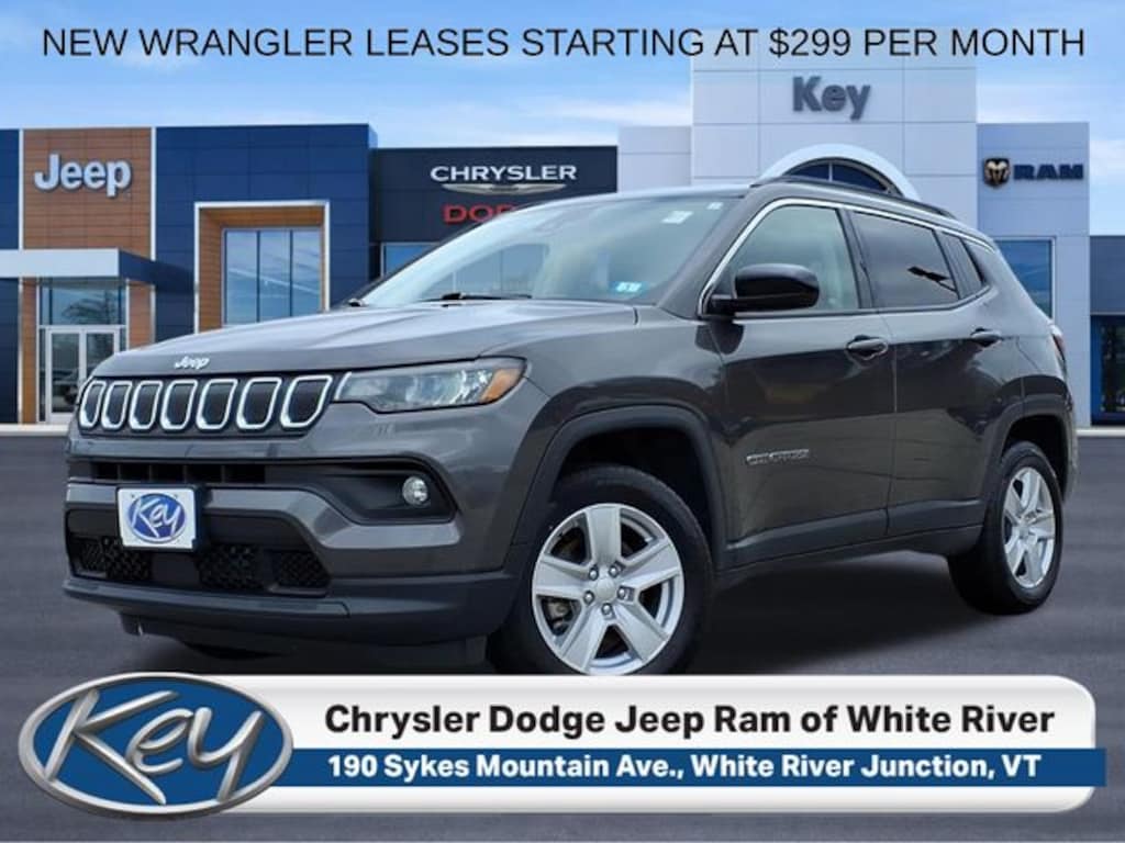 Key Chrysler Dodge Jeep Ram of White River is proud to present you with another True Market Priced Pre-Owned Vehicle. Transparent Pricing Of $ 18499 !! This 2022 Jeep Compass Latitude is loaded with the following Factory Options: 4WD Quick Order Package 2GJ, 4WD, 17" x 7" Painted Aluminum Wheels, 3.73 Axle Ratio, 4-Wheel Disc Brakes, 6 Speakers, ABS brakes, Air Conditioning, Alloy wheels, AM/FM radio: SiriusXM, Anti-whiplash front head restraints, Auto High-beam Headlights, Brake assist, Bumpers: body-color, Compass, Delay-off headlights, Driver door bin, Driver vanity mirror, Dual front impact airbags, Dual front side impact airbags, Electronic Stability Control, Emergency communication system: SiriusXM Guardian, Four wheel independent suspension, Front anti-roll bar, Front Bucket Seats, Front Center Armrest w/Storage, Front fog lights, Front License Plate Bracket, Front reading lights, Fully automatic headlights, Heated door mirrors, Illuminated entry, Knee airbag, Leather Shift Knob, Low tire pressure warning, Occupant sensing airbag, Outside temperature display, Overhead airbag, Overhead console, Panic alarm, ParkView Rear Back-Up Camera, Passenger door bin, Passenger vanity mirror, Power door mirrors, Power steering, Power windows, Premium Cloth/Vinyl Bucket Seats, Radio: Uconnect 5 w/10.1" Display, Rear anti-roll bar, Rear seat center armrest, Rear window defroster, Rear window wiper, Remote keyless entry, Roof rack: rails only, Speed control, Split folding rear seat, Spoiler, Steering wheel mounted audio controls, Tachometer, Telescoping steering wheel, Tilt steering wheel, Traction control, Trip computer, and Variably intermittent wipers!!