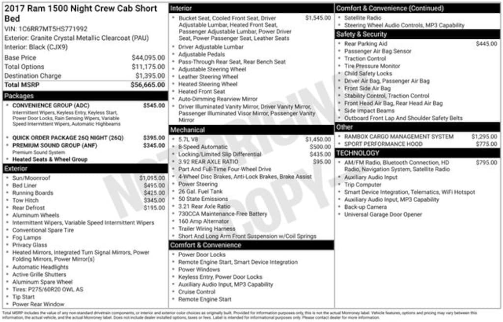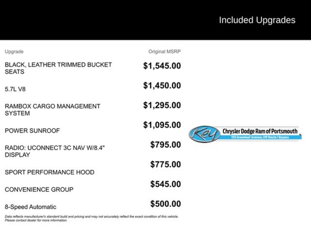 Key Chrysler Dodge Ram of Portsmouth is proud to present you with another True Market Priced Pre-Owned Vehicle. Transparent Pricing Of $ !! This 2017 Ram 1500 Night is loaded with the following Factory Options: Convenience Group (Auto High Beam Headlamp Control, Keyless Enter-N-Go, Rain Sensitive Windshield Wipers, and Remote Proximity Keyless Entry), Heated Seats & Wheel Group, Premium Sound Group (9 Alpine Speakers w/Subwoofer), Quick Order Package 26Q Night (4x4 Flat Black Badge, Black Painted Honeycomb Grille, Black Ram Tailgate Nameplate, Center Hub, Dual Rear Exhaust w/Bright Tips, Flat Black 5.7L Hemi Badge, Flat Black Ram 1500 Badge, Ram 1500 Night Special Edition, and Wheels: 20" x 9" Semi-Gloss Black Aluminum), 1 Yr. Trial (Registration Required), 115V Auxiliary Power Outlet, 20" x 9" Polished Aluminum Wheels, 4 Adjustable Cargo Tie-Down Hooks, 4-Wheel Disc Brakes, 5-Year SiriusXM Traffic Service, 5-Year SiriusXM Travel Link Service, 6 Speakers, 8.4" Touchscreen Display, ABS brakes, Active Grille Shutters, Adjustable pedals, Air Conditioning, Alloy wheels, AM/FM radio, Anti-Spin Differential Rear Axle, Audio Jack Input for Mobile Devices, Auto-dimming door mirrors, Auto-dimming Rear-View mirror, Automatic temperature control, Bed Cargo Divider/Extender, Black Tubular Side Steps, Brake assist, Bright Rotary Shifter, Bucket Seats, Bumpers: body-color, Class IV Receiver Hitch, Cloth Bucket Seats, Compass, Delay-off headlights, Driver door bin, Driver vanity mirror, Dual front impact airbags, Dual front side impact airbags, Electronic Shift, Electronic Stability Control, Electronically Controlled Throttle, Emergency communication system: Uconnect Access, Folding Flat Load Floor Storage, Front anti-roll bar, Front Bucket Seats, Front Center Armrest w/Storage, Front dual zone A/C, Front fog lights, Front reading lights, Front wheel independent suspension, Full Length Upgraded Floor Console, Fully automatic headlights, Garage door transmitter, GPS Antenna Input, GPS Navigation, HD Radio, Heated door mirrors, Heated Front Seats, Heated front seats, Heated Steering Wheel, Heated steering wheel, Heavy-Duty Engine Cooling, High Back Seats, Illuminated entry, Integrated Voice Command w/Bluetooth, Leather steering wheel, LED Bed Lighting, Low tire pressure warning, Media Hub (USB, AUX), Next Generation Engine Controller, Occupant sensing airbag, Outside temperature display, Overhead airbag, Overhead console, Panic alarm, ParkSense Front/Rear Park Assist System, ParkView Rear Back-Up Camera, Passenger door bin, Passenger vanity mirror, Power door mirrors, Power driver seat, Power Lumbar Adjust, Power steering, Power Sunroof, Power windows, Radio data system, Radio: Uconnect 3C Nav w/8.4" Display, Radio: Uconnect 3C w/8.4" Display, RamBox Cargo Management System, Rear 60/40 Split Folding Seat, Rear anti-roll ba