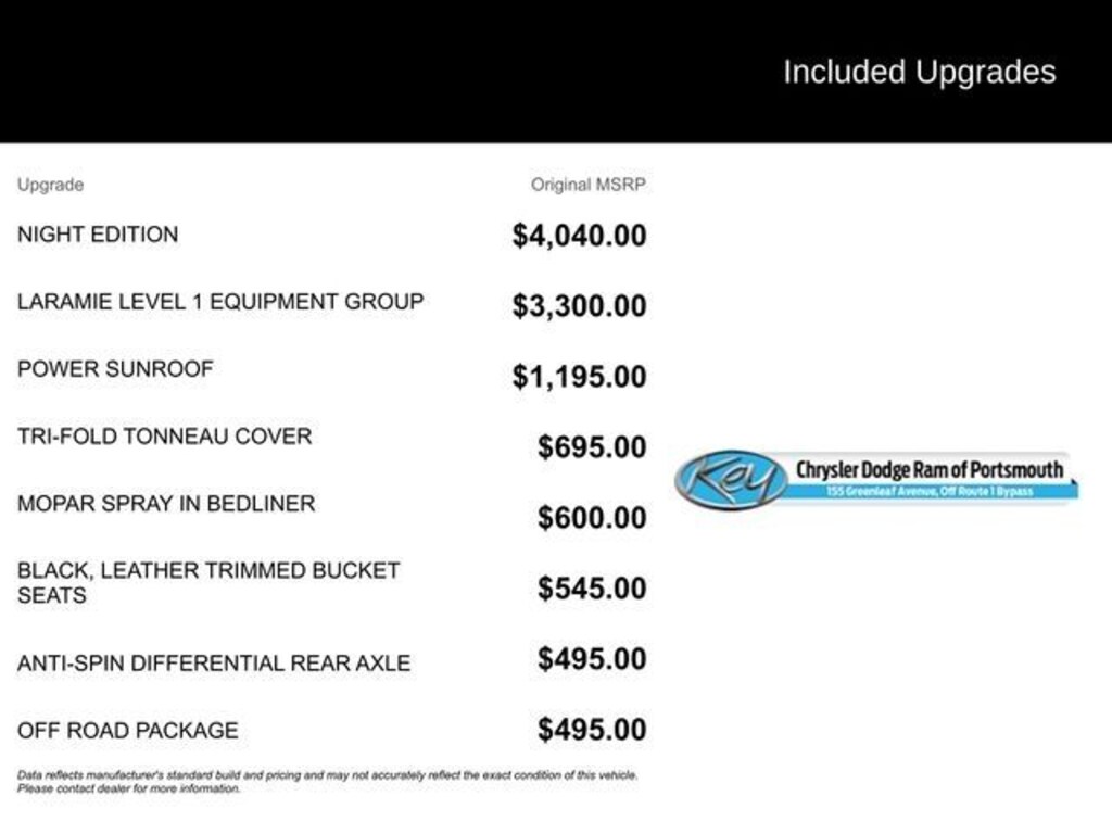 Key Chrysler Dodge Ram of Portsmouth is proud to present you with another True Market Priced Pre-Owned Vehicle. Transparent Pricing Of $ 50595 !! This 2023 Ram 2500 Laramie is loaded with the following Factory Options: Heavy Duty Snow Plow Prep Group (220 Amp Alternator), Laramie Level 1 Equipment Group (12" Touchscreen Display, 2nd Row In Floor Storage Bins, 4G LTE Wi-Fi Hot Spot, Alexa Built-In, Apple CarPlay, Auto Adjust In Reverse Exterior Mirrors, Auto Dim Exterior Mirror, Auto High Beam Headlamp Control, Auto Power-Folding Mirrors, Auto-Dimming Exterior Passenger Mirror, Blind Spot & Cross Path Detection, Chrome Exterior Mirrors, Connected Travel & Traffic Services, Connectivity - US/Canada, Disassociated Touchscreen Display, Exterior Mirrors Courtesy Lamps, Exterior Mirrors w/Heating Element, Exterior Mirrors w/Memory, Exterior Mirrors w/Supplemental Signals, Foam Bottle Insert (Door Trim Panel), For Details, Visit DriveUconnect.com, For More Info, Call 800-643-2112, Forward & Reverse Utility Lights, Front LED Fog Lamps, Global Telematics Box Module (TBM), Google Android Auto, GPS Antenna Input, GPS Navigation, HD Radio, Integrated Voice Command w/Bluetooth, LED Reflector Headlamps, Mirror Running Lights, Off-Road Information Pages, ParkSense Front/Rear Park Assist System, Power Adjust Mirrors, Power Adjustable Convex Aux Mirrors, Power Adjustable Pedals w/Memory, Power Heated Fold Telescopic Mirrors w/Memory, Power Telescoping Mirrors, Radio: Uconnect 5 Nav w/12.0" Display, Radio/Driver Seat/Mirrors/Pedals Memory, Rain Sensitive Windshield Wipers, Rear Power Sliding Window, Rear Window Defroster, Remote Tailgate Release, Selectable Tire Fill Alert, SiriusXM Radio Service, SiriusXM w/360L, and Trailer Tow Pages), Night Edition (Black Exterior Truck Badging, Black Headlamp Bezels, Black Interior Accents, Black Ram Head Tailgate Badge, Black Tail Lamp Bezels, Black Wheel Center Hub, Body Color Grille Surround, Gloss Black Grille Billets/Accents, Sport Performance Hood, and Wheels: 20" x 8.0" Black Painted Aluminum), Off Road Package (Front Performance Tuned Shock Absorbers, Hill Descent Control, Rear Performance Tuned Shock Absorbers, and Tow Hooks), Quick Order Package 2GH Laramie, 10 Speakers, 115V Auxiliary Rear Power Outlet, 2 Way Rear Headrest Seat, 4 Way Front Headrests, 4-Wheel Disc Brakes, ABS brakes, Active Noise Control System, Air Conditioning, Alloy wheels, AM/FM radio: SiriusXM with 360L, Anti-Spin Differential Rear Axle, Apple CarPlay/Android Auto, Auto-dimming Rear-View mirror, Automatic temperature control, Brake assist, Bumpers: body-color, Clearance Lamps, Compass, Dash Pass Thru Wire Circuits, Delay-off headlights, Driver door bin, Driver vanity mirror, Dual front impact airbags, Dual front side impact airbags, Electronic Stability Control, Electronically Controlled Throttle, Front anti-r