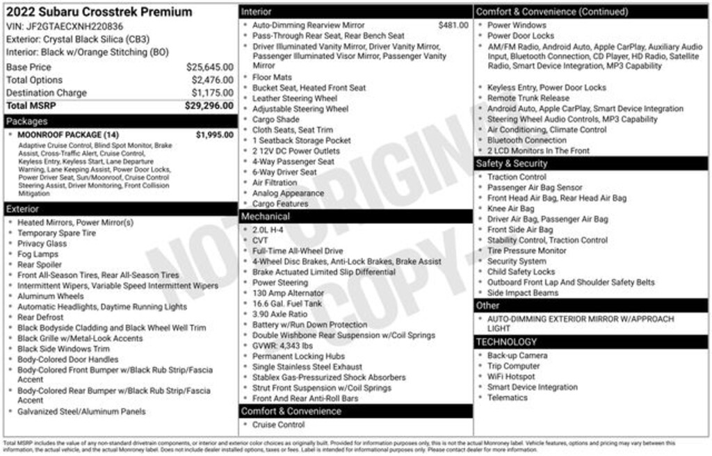 Key Chrysler Dodge Jeep Ram of White River is proud to present you with another True Market Priced Pre-Owned Vehicle. Transparent Pricing Of $ !! This 2022 Subaru Crosstrek Premium is loaded with the following Factory Options: Moonroof Package (6-Way Power Driver's Seat, Blind Spot Detection (BSD), EyeSight System, Keyless Access w/Push-Button Start, and Power Moonroof), 3.90 Axle Ratio, 4-Wheel Disc Brakes, 6 Speakers, ABS brakes, Air Conditioning, Alloy wheels, AM/FM radio: SiriusXM, Anti-whiplash front head restraints, Auto-Dimming Exterior Mirror w/Approach Light, Auto-Dimming Mirror w/Compass, Automatic temperature control, Brake assist, Bumpers: body-color, CD player, Cloth Upholstery, Driver door bin, Driver vanity mirror, Dual front impact airbags, Dual front side impact airbags, Electronic Stability Control, Emergency communication system: STARLINK Safety and Security (Subscription Required), Exterior Parking Camera Rear, Four wheel independent suspension, Front anti-roll bar, Front Bucket Seats, Front Center Armrest, Front fog lights, Front reading lights, Fully automatic headlights, Heated door mirrors, Heated Front Bucket Seats, Heated front seats, Illuminated entry, Knee airbag, Leather Shift Knob, Low tire pressure warning, Occupant sensing airbag, Outside temperature display, Overhead airbag, Overhead console, Panic alarm, Passenger door bin, Passenger vanity mirror, Power door mirrors, Power steering, Power windows, Radio data system, Radio: Subaru STARLINK 6.5" Multimedia Plus System, Rear anti-roll bar, Rear window defroster, Rear window wiper, Remote keyless entry, Security system, Speed control, Speed-sensing steering, Split folding rear seat, Spoiler, STARLINK/Apple CarPlay/Android Auto, Steering wheel mounted audio controls, Subaru STARLINK Smartphone Integration, Tachometer, Telescoping steering wheel, Tilt steering wheel, Traction control, Trip computer, Variably intermittent wipers, and Wheels: 17" x 7.0J Alloy Black w/Machine Finish!!